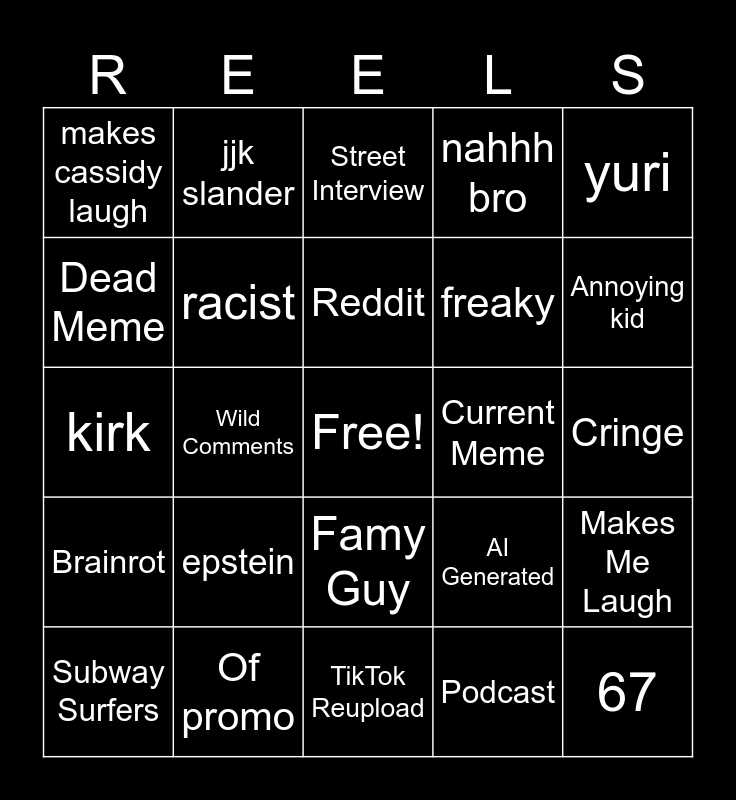 This bingo card has a free space and 24 words: epstein, Of promo, Reddit, Subway Surfers, yuri, makes cassidy laugh, Dead Meme, jjk slander, Current Meme, Famy Guy, freaky, kirk, AI Generated, Makes Me Laugh, racist, Podcast, Cringe, Street Interview, Annoying kid, Wild Comments, 67, Brainrot, nahhh bro and TikTok Reupload.
