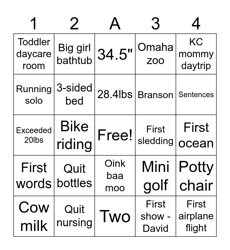 This bingo card has a free space and 34 words: Walking solo, New house, Mac n cheese, Corn sandbox, First ocean, Running solo, 3-sided bed, Two, Branson, First airplane flight, Exceeded 20lbs, Big girl bathtub, First show - David, First museum visit, First words, Bike riding, Oink baa moo, First sledding, Potty chair, Cow milk, Quit nursing, Cake, Omaha zoo, Sentences, Ear tubes, Quit bottles, 34.5", Mowing, KC mommy daytrip, Toddler daycare room, KC trip, 28.4lbs, Mini golf and Quit high chair.