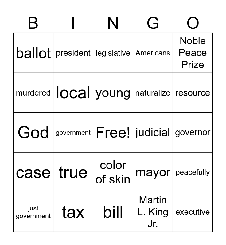 This bingo card has a free space and 24 words: true, tax, young, just government, Noble Peace Prize, ballot, murdered, president, judicial, color of skin, naturalize, God, mayor, peacefully, local, Martin L. King Jr., governor, legislative, resource, government, executive, case, Americans and bill.