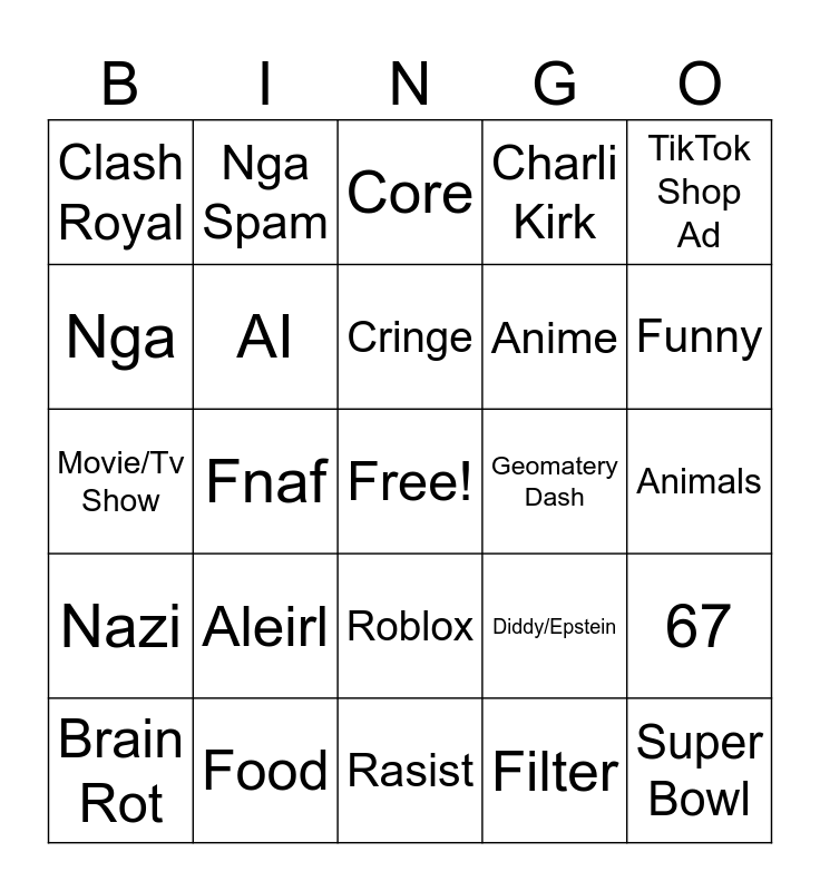 This bingo card has a free space and 24 words: Aleirl, Food, Cringe, Brain Rot, TikTok Shop Ad, Clash Royal, Nga, Nga Spam, Geomatery Dash, Roblox, Anime, Movie/Tv Show, Diddy/Epstein, 67, AI, Filter, Animals, Core, Funny, Fnaf, Super Bowl, Nazi, Charli Kirk and Rasist.