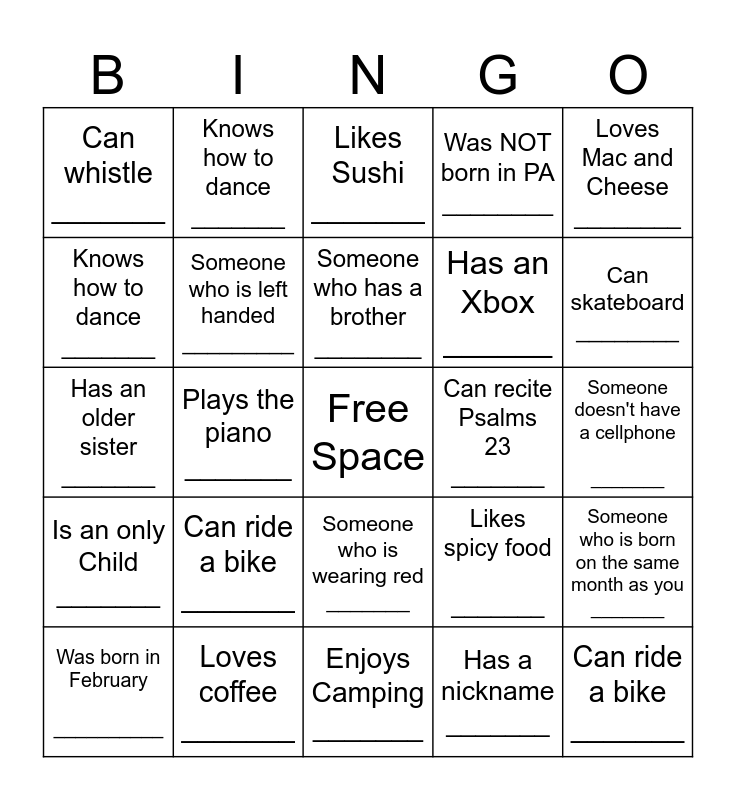 This bingo card has a free space and 32 words: Has a nickname _______, Is wearing jeans ________, Plays the piano _______, Has a Dog _______, Is an only Child _______, Someone who is left handed _________, Loves Mac and Cheese ________, Someone who is born on the same month as you _______, Knows how to dance _______, Hates Pizza _______, Someone who has a brother ________, Likes Sushi _______, Someone has traveled outside the country ________, Can whistle _______, Can recite Psalms 23 _______, Has a job ________, Was born in February __________, Has an older sister _______, Someone who is wearing red _______, Can ride a bike _______, Likes spicy food _______, Someone who can speak another language _______, Someone doesn't have a cellphone _______, Loves coffee _______, Can ride a bike _______, Was NOT born in PA ________, Has an Xbox ______, Knows how to dance _______, Can whistle _______, Enjoys Camping _______, Has a nickname _______ and Can skateboard ________.