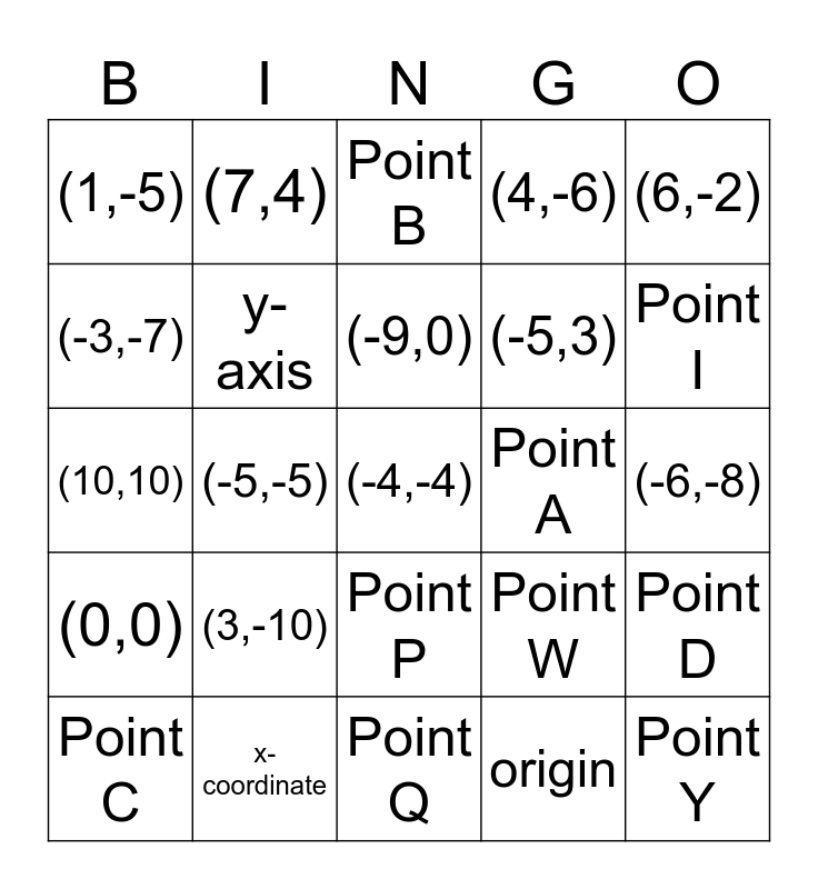 This bingo card has 59 words: ordered pair, x-coordinate, y-coordinate, (0,0), origin, x-axis, y-axis, (2,7), (-5,3), (-8,-1), (4,-6), (0,8), (-3,-7), (9,-3), (-10,6), (1,-5), (-4,-4), (6,-2), (0,5), (-9,0), Point A, Point B, Point C, Point D, Point E, Point F, Point G, Point H, Point I, Point J, Point K, Point L, Point M, (1,1), (7,4), (-2,9), (8,-8), (-5,-5), (0,-9), (10,10), (-1,-1), (3,-10), (-6,-8), (5,5), (-7,2), (4,0), Point N, Point O, Point P, Point Q, Point R, Point S, Point T, Point U, Point V, Point W, Point X, Point Y and Point Z.