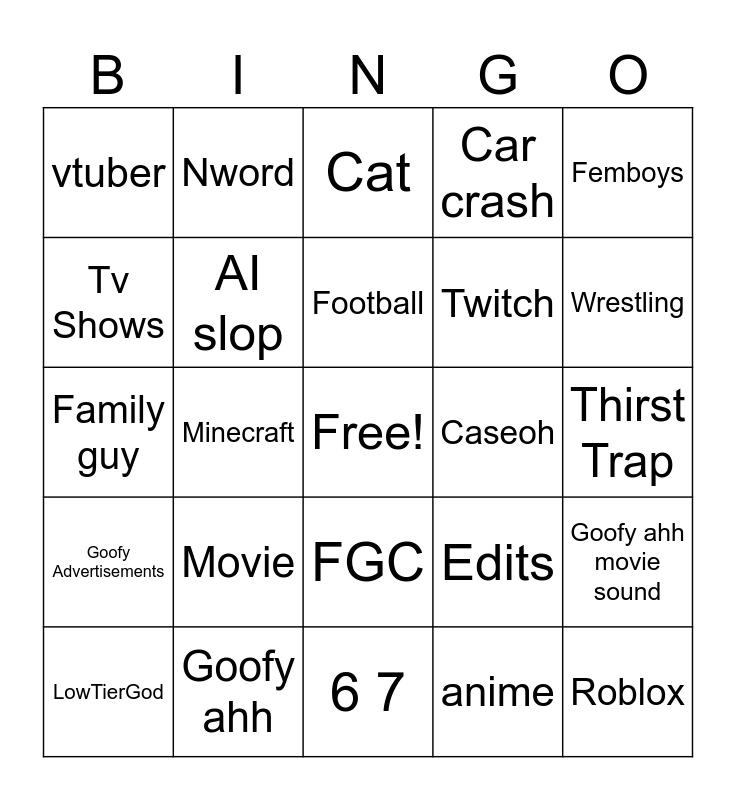 This bingo card has a free space and 24 words: Movie, Goofy ahh, Football, LowTierGod, Femboys, vtuber, Tv Shows, Nword, Caseoh, FGC, Twitch, Family guy, Edits, Goofy ahh movie sound, AI slop, anime, Thirst Trap, Cat, Wrestling, Minecraft, Roblox, Goofy Advertisements, Car crash and 6 7.