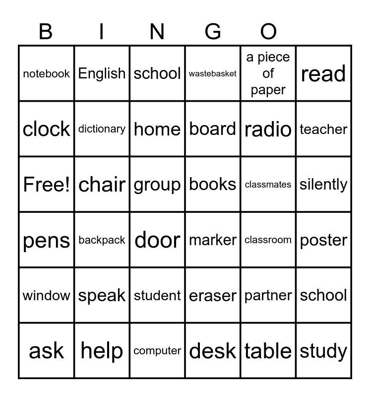 This bingo card has 36 words: eraser, student, desk, clock, pens, books, dictionary, computer, a piece of paper, partner, teacher, wastebasket, school, chair, board, notebook, window, classmates, Free!, school, group, backpack, marker, door, classroom, English, radio, help, home, read, study, ask, poster, silently, speak and table.