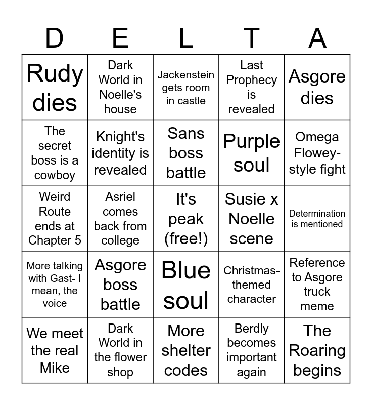 This bingo card has a free space and 24 words: Asgore boss battle, Dark World in the flower shop, Sans boss battle, We meet the real Mike, Asgore dies, Rudy dies, The secret boss is a cowboy, Dark World in Noelle's house, Susie x Noelle scene, Blue soul, Purple soul, Weird Route ends at Chapter 5, Christmas-themed character, Reference to Asgore truck meme, Knight's identity is revealed, Berdly becomes important again, Determination is mentioned, Jackenstein gets room in castle, Omega Flowey-style fight, Asriel comes back from college, The Roaring begins, More talking with Gast- I mean, the voice, Last Prophecy is revealed and More shelter codes.