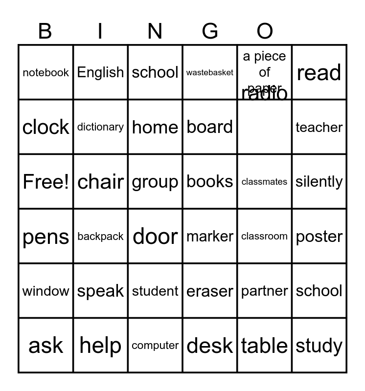 This bingo card has 36 words: eraser, student, desk, clock, pens, books, dictionary, computer, a piece of paper, partner, teacher, wastebasket, school, chair, board, notebook, window, classmates, Free!, school, group, backpack, marker, door, classroom, English, radio, help, home, read, study, ask, poster, silently, speak and table.