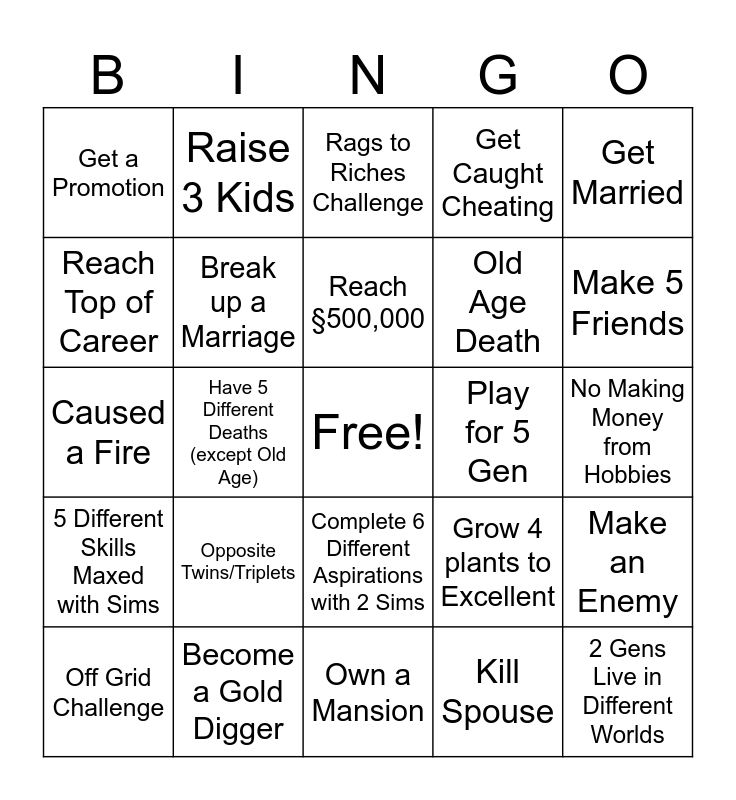 This bingo card has a free space and 24 words: Opposite Twins/Triplets, Become a Gold Digger, Reach §500,000, Off Grid Challenge, Get Married, Get a Promotion, Reach Top of Career, Raise 3 Kids, Play for 5 Gen, Complete 6 Different Aspirations with 2 Sims, Old Age Death, Caused a Fire, Grow 4 plants to Excellent, Make an Enemy, Break up a Marriage, Kill Spouse, No Making Money from Hobbies, Rags to Riches Challenge, Make 5 Friends, Have 5 Different Deaths (except Old Age), 2 Gens Live in Different Worlds, 5 Different Skills Maxed with Sims, Get Caught Cheating and Own a Mansion.