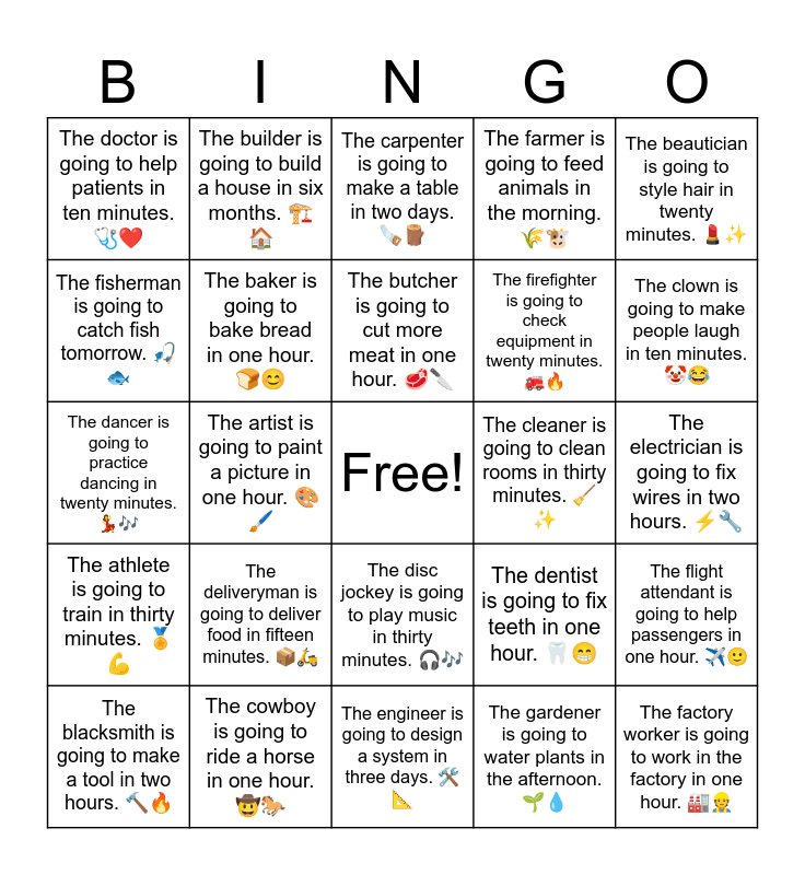 This bingo card has a free space and 33 words: The actor is going to act in a play in two hours. ๐ญโฐ, The archaeologist is going to study ruins in three days. ๐บ๐ , The artist is going to paint a picture in one hour. ๐จ๐๏ธ, The astronaut is going to work in space in six months. ๐๐, The athlete is going to train in thirty minutes. ๐ ๐ช, The baker is going to bake bread in one hour. ๐๐, The beautician is going to style hair in twenty minutes. ๐โจ, The blacksmith is going to make a tool in two hours. ๐จ๐ฅ, The builder is going to build a house in six months. ๐๏ธ๐ , The bus driver is going to drive people in ten minutes. ๐๐, The butcher is going to cut more meat in one hour. ๐ฅฉ๐ช, The carpenter is going to make a table in two days. ๐ช๐ชต, The cashier is going to take money in five minutes. ๐ต๐งพ, The chef is going to cook dinner in one hour. ๐จโ๐ณ๐ฒ, The cleaner is going to clean rooms in thirty minutes. ๐งนโจ, The clown is going to make people laugh in ten minutes. ๐คก๐, The cowboy is going to ride a horse in one hour. ๐ค ๐, The dancer is going to practice dancing in twenty minutes. ๐๐ถ, The deliveryman is going to deliver food in fifteen minutes. ๐ฆ๐ต, The dentist is going to fix teeth in one hour. ๐ฆท๐, The disc jockey is going to play music in thirty minutes. ๐ง๐ถ, The diver is going to work underwater in one hour. ๐คฟ๐, The doctor is going to help patients in ten minutes. ๐ฉบโค๏ธ, The electrician is going to fix wires in two hours. โก๐ง, The engineer is going to design a system in three days. ๐ ๏ธ๐, The factory worker is going to work in the factory in one hour. ๐ญ๐ท, The farmer is going to feed animals in the morning. ๐พ๐ฎ, The firefighter is going to check equipment in twenty minutes. ๐๐ฅ, The fisherman is going to catch fish tomorrow. ๐ฃ๐, The flight attendant is going to help passengers in one hour. โ๏ธ๐, The florist is going to arrange flowers in thirty minutes. ๐๐ธ, The gardener is going to water plants in the afternoon. ๐ฑ๐ง and The hairdresser is going to cut hair in fifteen minutes. โ๏ธ๐.