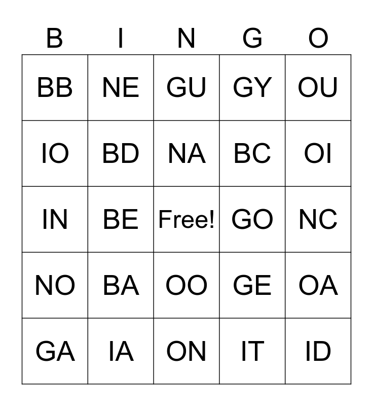 This bingo card has a free space and 24 words: BA, IA, NA, GA, OU, BB, IO, NE, GO, OO, BC, IN, GE, OA, BD, IT, NC, GU, OI, BE, ID, NO, GY and ON.