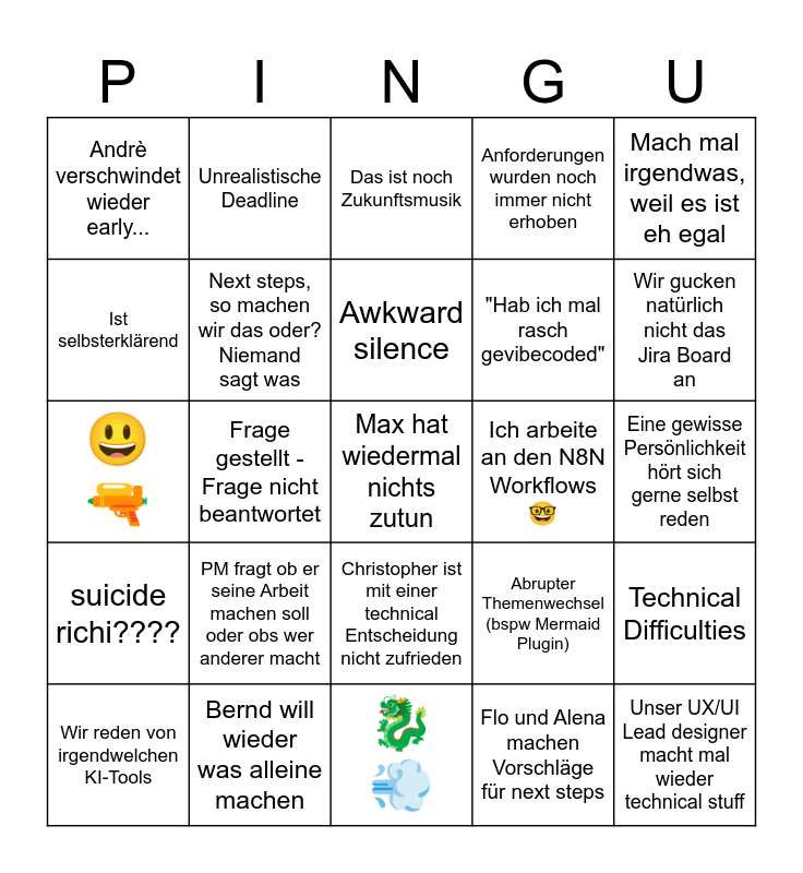 This bingo card has 28 words: Technical Difficulties, Backlog, was ist das?, "Hab ich mal rasch gevibecoded", Flo und Alena machen Vorschläge für next steps, Ist selbsterklärend, Das ist noch Zukunftsmusik, Unrealistische Deadline, suicide richi????, Ich arbeite an den N8N Workflows 🤓, Wir reden von irgendwelchen KI-Tools, 😃🔫, Anforderungen wurden noch immer nicht erhoben, Bernd will wieder was alleine machen, 🐉💨, Wir gucken natürlich nicht das Jira Board an, noch immer keine Systemarchitektur Grafik, PM fragt ob er seine Arbeit machen soll oder obs wer anderer macht, Next steps, so machen wir das oder? Niemand sagt was, Awkward silence, Christopher ist mit einer technical Entscheidung nicht zufrieden, Andrè verschwindet wieder early..., Unser UX/UI Lead designer macht mal wieder technical stuff, Max hat wiedermal nichts zutun, Frage gestellt - Frage nicht beantwortet, Eine gewisse Persönlichkeit hört sich gerne selbst reden, Abrupter Themenwechsel (bspw Mermaid Plugin), Mach mal irgendwas, weil es ist eh egal and Bernd hat gesagt "Ich mach das" und macht es anschliesend nicht.