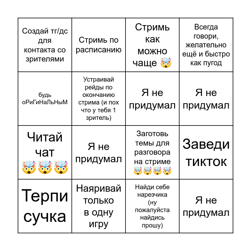 This bingo card has 16 words: Наяривай только в одну игру, Заведи тикток, Стримь как можно чаще 🤯, Создай тг/дс для контакта со зрителями, Читай чат 🤯🤯🤯, Стримь по расписанию, Заготовь темы для разговора на стриме 🤯🤯🤯🤯, Найди себе нарезчика (ну пожалуйста найдись прошу), будь оРиГиНаЛьНыМ, Устраивай рейды по окончанию стрима (и пох что у тебя 1 зритель), Терпи сучка, Всегда говори, желательно ещё и быстро как пугод, Я не придумал, Я не придумал, Я не придумал and Я не придумал.