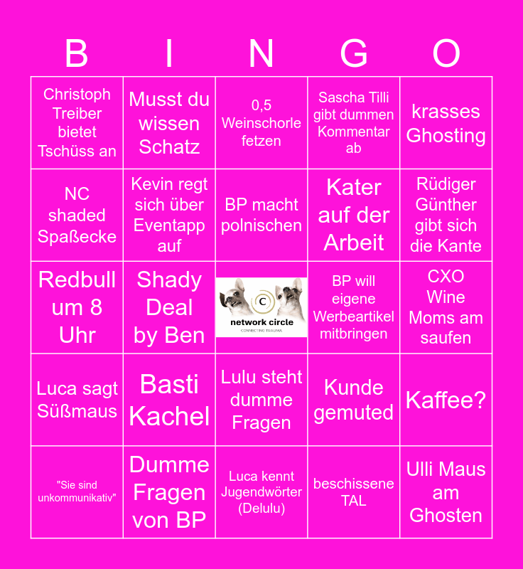 This bingo card has a free space and 24 words: Basti Kachel, Dumme Fragen von BP, BP macht polnischen, "Sie sind unkommunikativ", krasses Ghosting, Christoph Treiber bietet Tschüss an, NC shaded Spaßecke, Musst du wissen Schatz, BP will eigene Werbeartikel mitbringen, Lulu steht dumme Fragen, Kater auf der Arbeit, Redbull um 8 Uhr, Kunde gemuted, Kaffee?, Kevin regt sich über Eventapp auf, beschissene TAL, CXO Wine Moms am saufen, 0,5 Weinschorle fetzen, Rüdiger Günther gibt sich die Kante, Shady Deal by Ben, Ulli Maus am Ghosten, Luca sagt Süßmaus, Sascha Tilli gibt dummen Kommentar ab and Luca kennt Jugendwörter (Delulu).