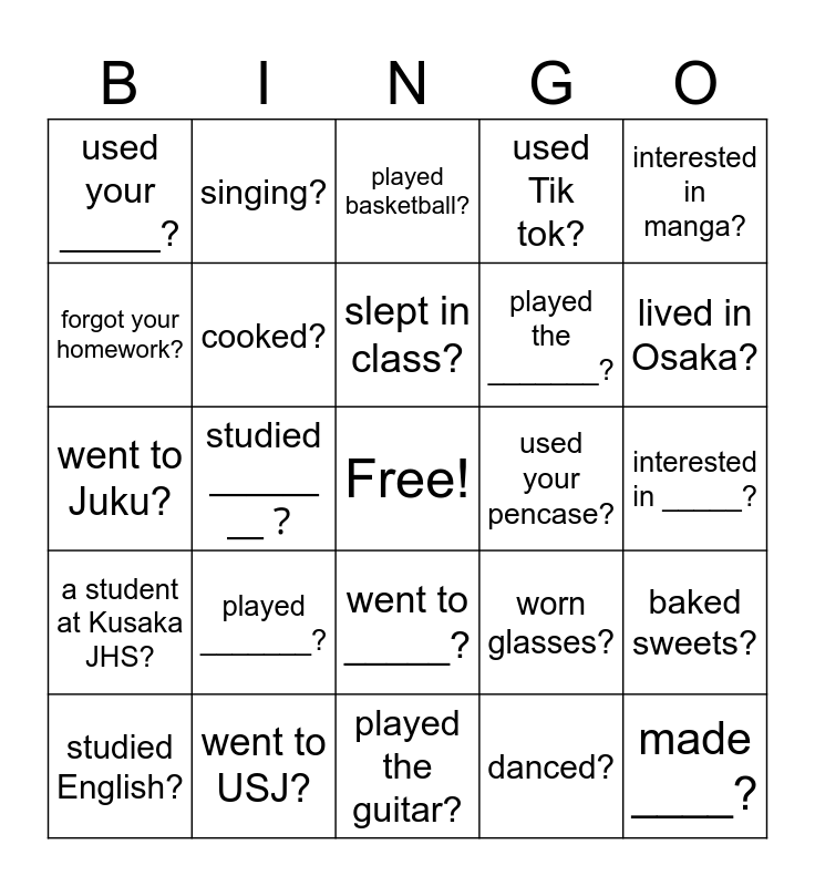 This bingo card has a free space and 24 words: played _______?, went to USJ?, slept in class?, studied English?, interested in manga?, used your _____?, forgot your homework?, singing?, used your pencase?, went to _____?, played the _______?, went to Juku?, worn glasses?, baked sweets?, cooked?, danced?, interested in _____?, played basketball?, lived in Osaka?, studied ____?, made ____?, a student at Kusaka JHS?, used Tik tok? and played the guitar?.