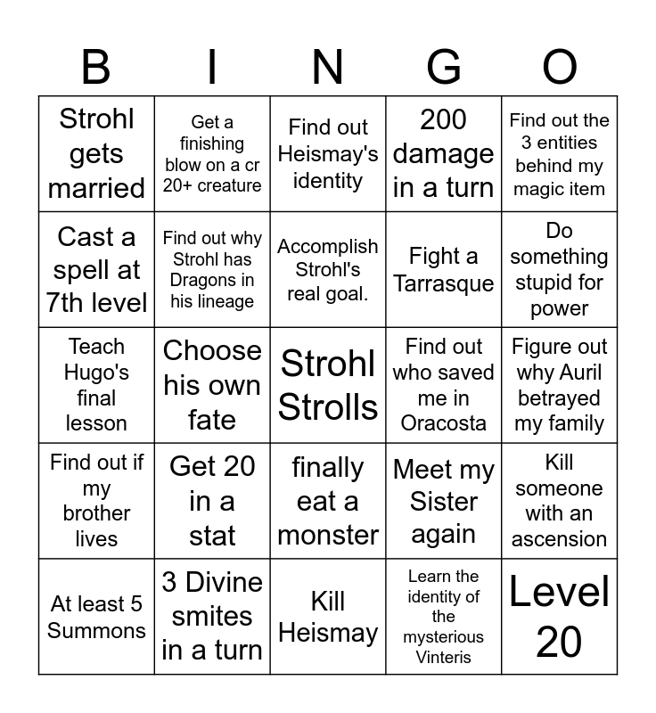 This bingo card has a free space and 24 words: Get 20 in a stat, 3 Divine smites in a turn, Accomplish Strohl's real goal., At least 5 Summons, Find out the 3 entities behind my magic item, Strohl gets married, Cast a spell at 7th level, Get a finishing blow on a cr 20+ creature, Find out who saved me in Oracosta, finally eat a monster, Fight a Tarrasque, Teach Hugo's final lesson, Meet my Sister again, Kill someone with an ascension, Find out why Strohl has Dragons in his lineage, Learn the identity of the mysterious Vinteris, Figure out why Auril betrayed my family, Find out Heismay's identity, Do something stupid for power, Choose his own fate, Level 20, Find out if my brother lives, 200 damage in a turn and Kill Heismay.
