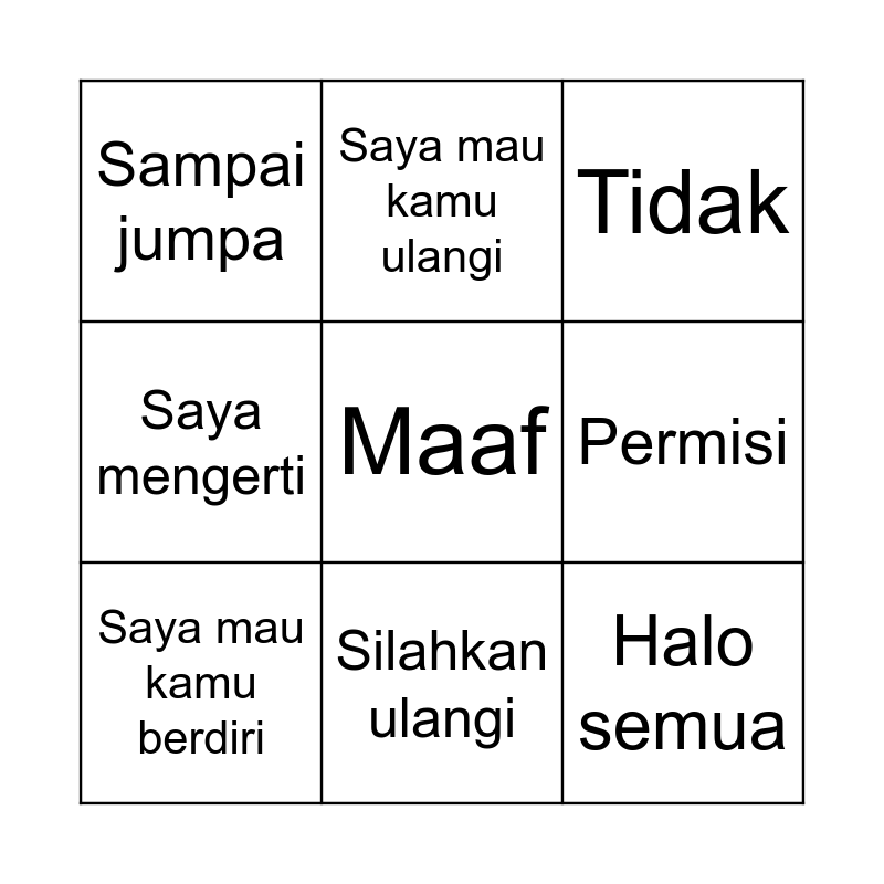 This bingo card has 13 words: Silahkan duduk, Silahkan ke sini, Saya mau kamu berdiri, Saya mau kamu ulangi, Saya mengerti, Maaf, Halo semua, Silahkan dengar, Silahkan ulangi, Sampai jumpa, Permisi, Tidak and Ya.