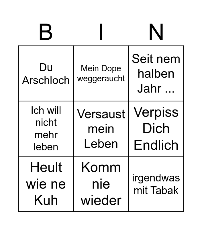 This bingo card has a free space and 8 words: Verpiss Dich Endlich, Seit nem halben Jahr ..., Mein Dope weggeraucht, Heult wie ne Kuh, Du Arschloch, irgendwas mit Tabak, Ich will nicht mehr leben and Komm nie wieder.