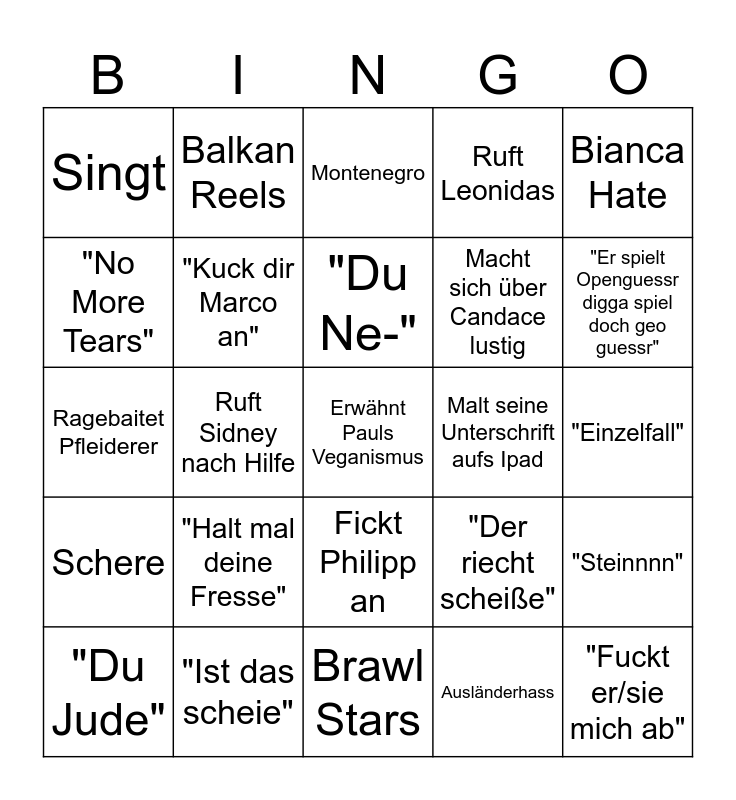 This bingo card has 25 words: "Halt mal deine Fresse", Brawl Stars, "Du Ne-", "Du Jude", Bianca Hate, Singt, "No More Tears", Balkan Reels, Malt seine Unterschrift aufs Ipad, Fickt Philipp an, Macht sich über Candace lustig, Ragebaitet Pfleiderer, "Der riecht scheiße", "Steinnnn", "Kuck dir Marco an", "Fuckt er/sie mich ab", "Einzelfall", Montenegro, "Er spielt Openguessr digga spiel doch geo guessr", Ruft Sidney nach Hilfe, Erwähnt Pauls Veganismus, "Ist das scheie", Schere, Ruft Leonidas and Ausländerhass.