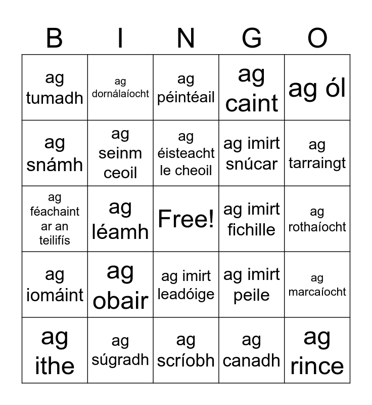 This bingo card has a free space and 24 words: ag obair, ag súgradh, ag éisteacht le cheoil, ag ithe, ag ól, ag tumadh, ag snámh, ag dornálaíocht, ag imirt fichille, ag imirt leadóige, ag imirt snúcar, ag féachaint ar an teilifís, ag imirt peile, ag marcaíocht, ag seinm ceoil, ag canadh, ag rothaíocht, ag péintéail, ag tarraingt, ag léamh, ag rince, ag iomáint, ag caint and ag scríobh.