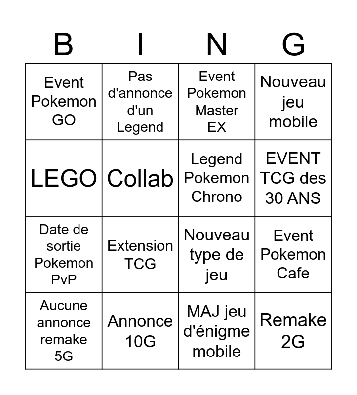 This bingo card has 16 words: Annonce 10G, Event Pokemon Cafe, Event Pokemon Master EX, Event Pokemon GO, Date de sortie Pokemon PvP, Pas d'annonce d'un Legend, Nouveau type de jeu, MAJ jeu d'énigme mobile, LEGO, Collab, Aucune annonce remake 5G, Nouveau jeu mobile, Extension TCG, EVENT TCG des 30 ANS, Legend Pokemon Chrono and Remake 2G.