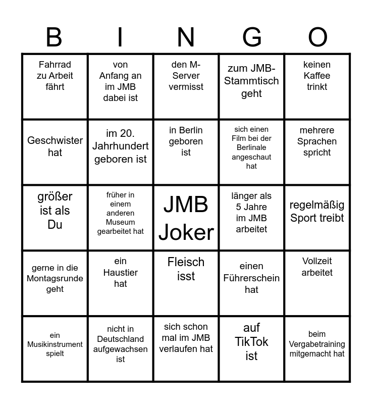 This bingo card has a free space and 24 words: ein Haustier hat, nicht in Deutschland aufgewachsen ist, in Berlin geboren ist, ein Musikinstrument spielt, keinen Kaffee trinkt, Fahrrad zu Arbeit fährt, Geschwister hat, von Anfang an im JMB dabei ist, länger als 5 Jahre im JMB arbeitet, Fleisch isst, sich einen Film bei der Berlinale angeschaut hat, größer ist als Du, einen Führerschein hat, Vollzeit arbeitet, im 20. Jahrhundert geboren ist, auf TikTok ist, regelmäßig Sport treibt, den M-Server vermisst, mehrere Sprachen spricht, früher in einem anderen Museum gearbeitet hat, beim Vergabetraining mitgemacht hat, gerne in die Montagsrunde geht, zum JMB-Stammtisch geht and sich schon mal im JMB verlaufen hat.