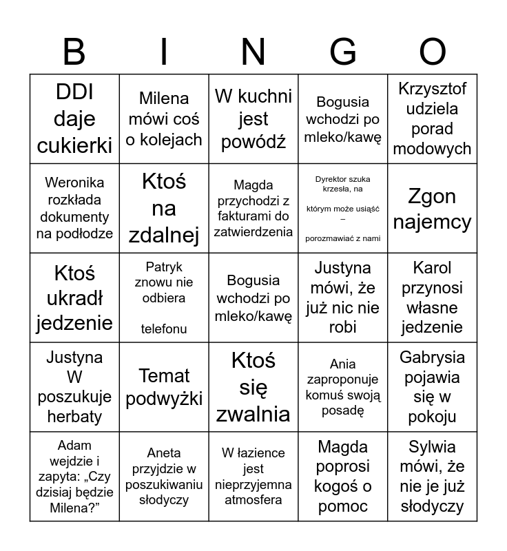 This bingo card has a free space and 24 words: Temat podwyżki, Aneta przyjdzie w poszukiwaniu słodyczy, Magda przychodzi z fakturami do zatwierdzenia, Adam wejdzie i zapyta: „Czy dzisiaj będzie Milena?”, Krzysztof udziela porad modowych, DDI daje cukierki, Weronika rozkłada dokumenty na podłodze, Milena mówi coś o kolejach, Justyna mówi, że już nic nie robi, Ktoś się zwalnia, Dyrektor szuka krzesła, na którym może usiąść – porozmawiać z nami, Ktoś ukradł jedzenie, Ania zaproponuje komuś swoją posadę, Gabrysia pojawia się w pokoju, Ktoś na zdalnej, Magda poprosi kogoś o pomoc, Karol przynosi własne jedzenie, W kuchni jest powódź, Zgon najemcy, Patryk znowu nie odbiera telefonu, Sylwia mówi, że nie je już słodyczy, Justyna W poszukuje herbaty, Bogusia wchodzi po mleko/kawę and W łazience jest nieprzyjemna atmosfera.