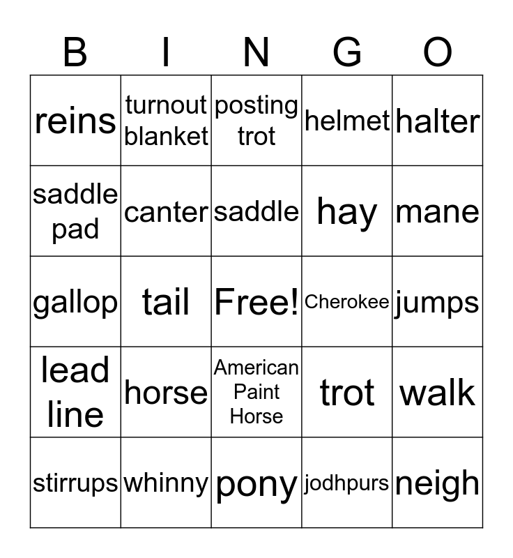 This bingo card has a free space and 25 words: horse, pony, saddle, stirrups, halter, reins, saddle pad, turnout blanket, Cherokee, American Paint Horse, hay, gallop, trot, walk, canter, ground poles, jumps, posting trot, mane, tail, neigh, whinny, lead line, helmet and jodhpurs.