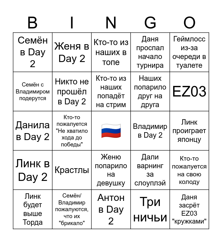 This bingo card has a free space and 24 words: Крастлы, Семён/Владимир пожалуются, что их "брикало", Кто-то из наших попадёт на стрим, Линк будет выше Торда, Геймлосс из-за очереди в туалете, Семён в Day 2, Семён с Владимиром подерутся, Женя в Day 2, Владимир в Day 2, Женю попарило на девушку, Наших попарило друг на друга, Данила в Day 2, Дали варнинг за слоуплэй, Кто-то пожалуется на свою колоду, Никто не прошёл в Day 2, Три ничьи, Линк проиграет японцу, Кто-то из наших в топе, EZ03, Кто-то пожалуется "Не хватило хода до победы", Даня засрёт EZ03 "кружками", Линк в Day 2, Даня проспал начало турнира and Антон в Day 2.