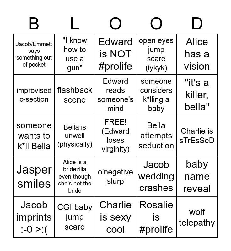 This bingo card has a free space and 24 words: Alice is a bridezilla even though she's not the bride, CGI baby jump scare, Edward reads someone's mind, Jacob imprints :-0 >:(, Alice has a vision, Jacob/Emmett says something out of pocket, improvised c-section, "I know how to use a gun", Bella attempts seduction, o'negative slurp, someone considers k*lling a baby, someone wants to k*ll Bella, Jacob wedding crashes, baby name reveal, flashback scene, Rosalie is #prolife, Charlie is sTrEsSeD, Edward is NOT #prolife, "it's a killer, bella", Bella is unwell (physically), wolf telepathy, Jasper smiles, open eyes jump scare (iykyk) and Charlie is sexy cool.