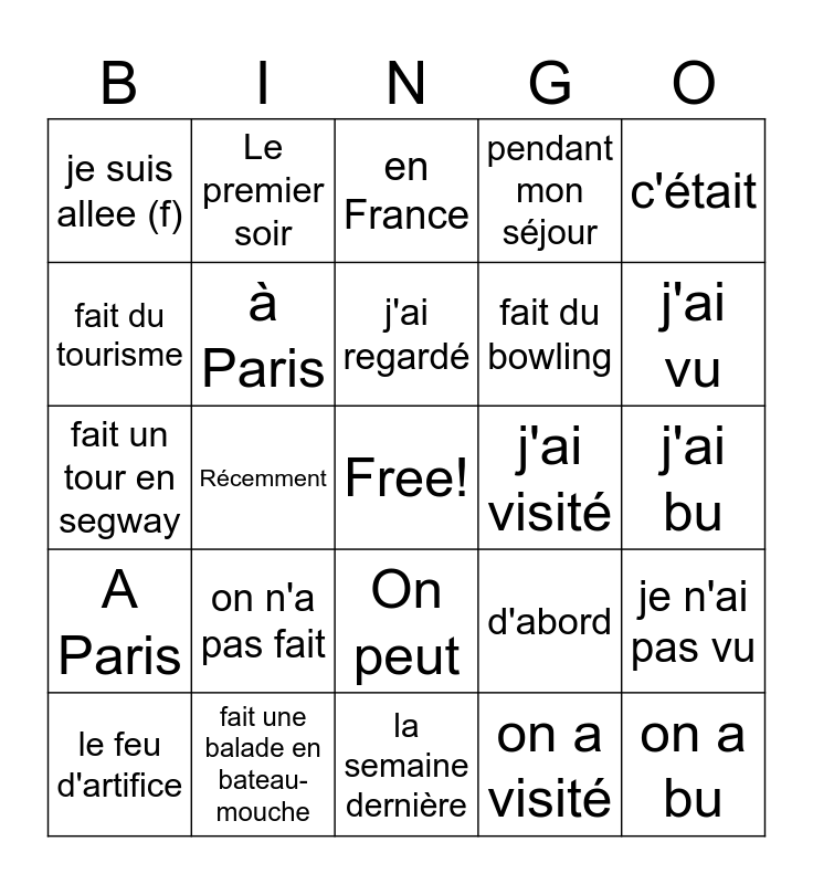 This bingo card has a free space and 31 words: la semaine dernière, Samedi dernier, Récemment, je suis allé(m), je suis allee (f), en France, à Paris, d'abord, j'ai visité, on a visité, j'ai bu, on a bu, j'ai fait, on a fait, j'ai vu, on a vu, je n'ai pas vu, on n'a pas fait, A Paris, On peut, c'était, le défilé, le feu d'artifice, Le premier soir, fait du bowling, fait du tourisme, pendant mon séjour, fait un tour en segway, fait une balade en bateau-mouche, j'ai regardé and j'ai visité.