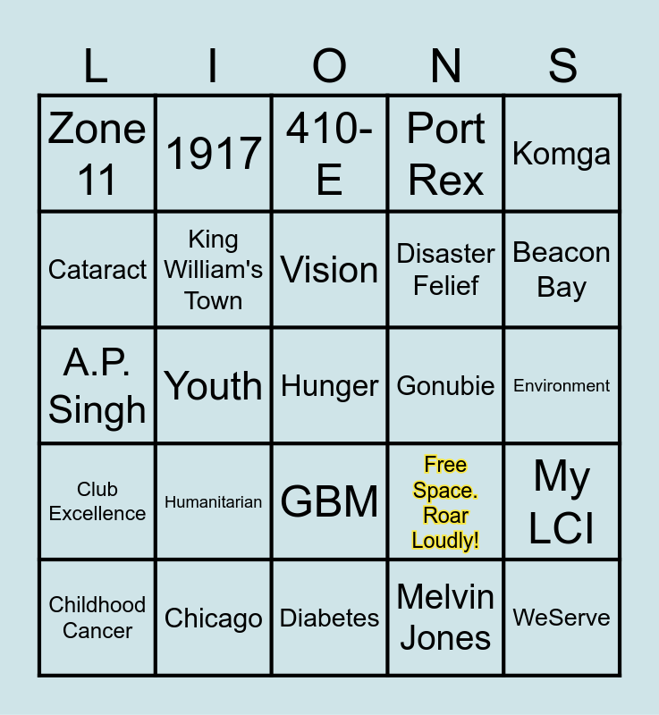 This bingo card has 25 words: Humanitarian, Diabetes, Vision, Childhood Cancer, Komga, Zone 11, Cataract, 1917, Gonubie, GBM, Disaster Felief, A.P. Singh, Free Space. Roar Loudly!, My LCI, King William's Town, WeServe, Environment, 410-E, Beacon Bay, Youth, Hunger, Chicago, Club Excellence, Port Rex and Melvin Jones.