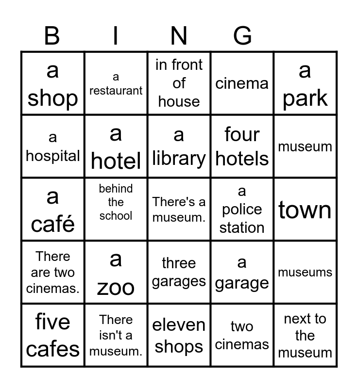 This bingo card has 25 words: a zoo, eleven shops, a library, five cafes, a park, a shop, a hospital, a restaurant, a police station, three garages, four hotels, a café, a garage, museums, a hotel, next to the museum, town, in front of house, museum, behind the school, There's a museum., There isn't a museum., There are two cinemas., cinema and two cinemas.