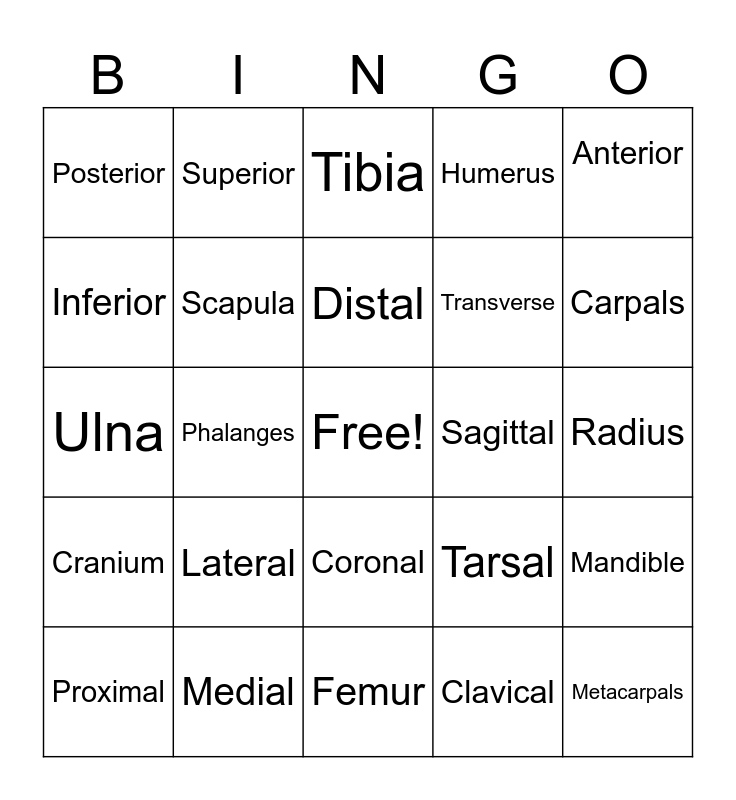 This bingo card has a free space and 24 words: Lateral, Medial, Distal, Proximal, Anterior, Posterior, Inferior, Superior, Sagittal, Coronal, Transverse, Ulna, Tarsal, Mandible, Scapula, Clavical, Radius, Tibia, Carpals, Phalanges, Metacarpals, Cranium, Humerus and Femur.