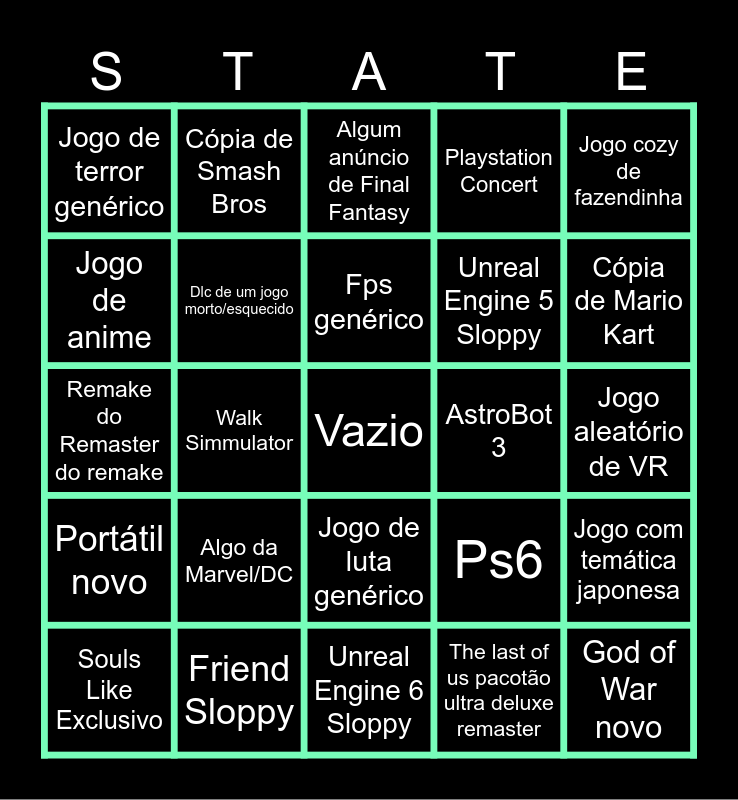 This bingo card has a free space and 24 words: Algo da Marvel/DC, Friend Sloppy, Fps genérico, Souls Like Exclusivo, Jogo cozy de fazendinha, Jogo de terror genérico, Jogo de anime, Cópia de Smash Bros, AstroBot 3, Jogo de luta genérico, Unreal Engine 5 Sloppy, Remake do Remaster do remake, Ps6, Jogo com temática japonesa, Dlc de um jogo morto/esquecido, The last of us pacotão ultra deluxe remaster, Jogo aleatório de VR, Algum anúncio de Final Fantasy, Cópia de Mario Kart, Walk Simmulator, God of War novo, Portátil novo, Playstation Concert and Unreal Engine 6 Sloppy.