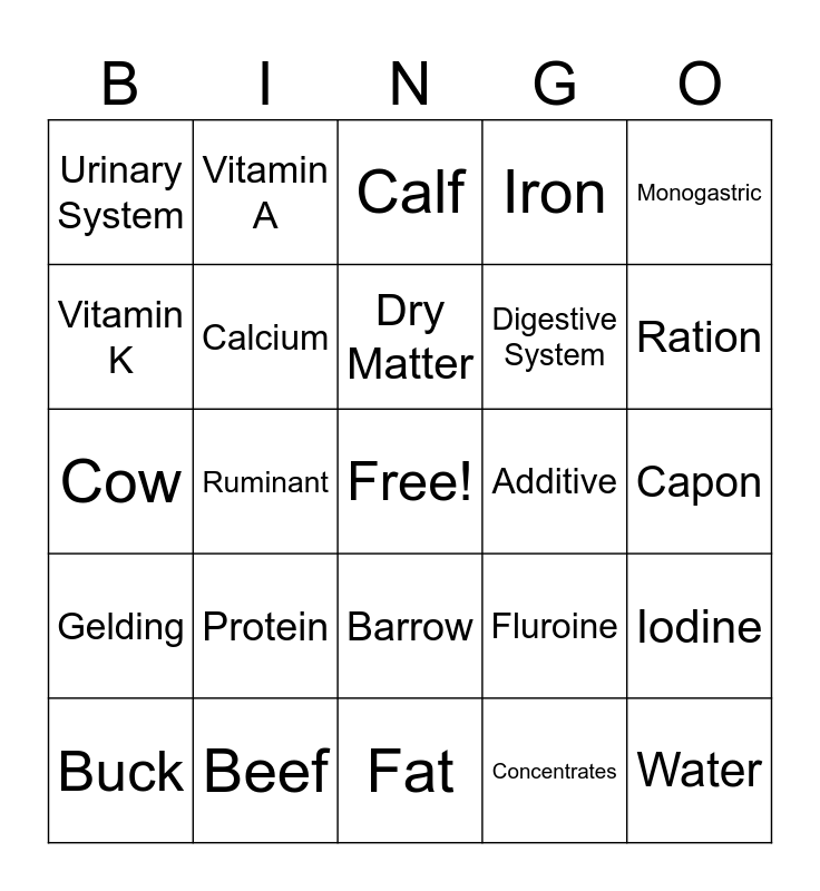 This bingo card has a free space and 48 words: Vitamins, Water, Minerals, Fat, Protein, Carbohydrates, Vitamin A, Vitamin C, Vitamin K, Vitamin D, Calcium, Iron, Iodine, Fluroine, 75, 10-20, Dry Matter, Additive, Urea, Monogastric, Ruminant, Concentrates, Urinary System, Digestive System, Skeletal System, Ration, Buck, Heifer, Barrow, Gelding, Farrowing, Ewe, Hen, Prok, Beef, Gilt, Mare, Capon, Rooster, Wether, Bull, Chevon, Calf, Steer, Cow, Zinc, Roughages and Mutton.