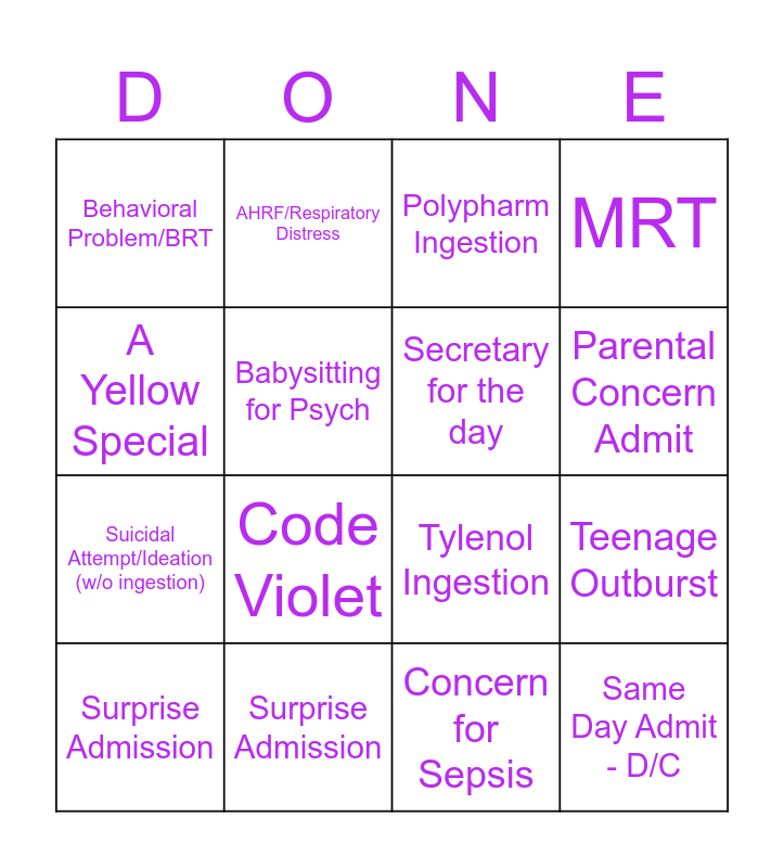This bingo card has 18 words: Code Violet, Same Day Admit - D/C, Polypharm Ingestion, Behavioral Problem/BRT, Tylenol Ingestion, MRT, Surprise Admission, AHRF/Respiratory Distress, Parental Concern Admit, Suicidal Attempt/Ideation (w/o ingestion), Concern for Sepsis, A Yellow Special, Teenage Outburst, Babysitting for Psych, Secretary for the day, Super sick direct admission (FT or JP), Surprise Admission and Awaiting Placement.