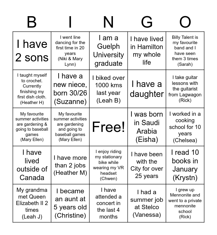 This bingo card has a free space and 24 words: I have more than 2 jobs (Heather M), I became an aunt at 5 years old (Christine), I biked over 1000 kms last year (Leah B), My grandma met Queen Elizabeth II 2 times (Leah J), Billy Talent is my favourite band and I have seen them 3 times (Sarah), I have 2 sons, I taught myself to crochet. Currently finishing my first dish cloth. (Heather H), I went line dancing for the first time in 20 years (Niki & Mary Lynn), I was born in Saudi Arabia (Eisha), I enjoy riding my stationary bike while wearing my VR headset (Chwen), I have a daughter, My favourite summer activities are gardening & going to baseball games (Mary Ellen), I have been with the City for over 25 years, I read 10 books in January (Krystn), I have a new niece, born 30/26 (Suzanne), I had a summer job at Stelco (Vanessa), I worked in a cooking school for 10 years (Chelsea), I am a Guelph University graduate, I take guitar lessons with the guitarist from Lagwagon (Rick), My favourite summer activities are gardening and going to baseball games (Mary Ellen), I grew up Mennonite and went to a private mennonite school (Rick), I have lived outside of Canada, I have lived in Hamilton my whole life and I have attended a concert in the last 4 months.
