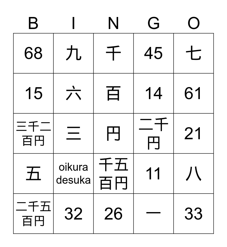 This bingo card has a free space and 32 words: 一, 二, 三, 四, 五, 六, 七, 八, 九, 十, 百, 千, 千円, 五百円, 二千円, 三千円, 二千五百円, 三千二百円, 千五百円, oikura desuka, 11, 12, 21, 32, 33, 45, 14, 15, 68, 26, 16 and 61.