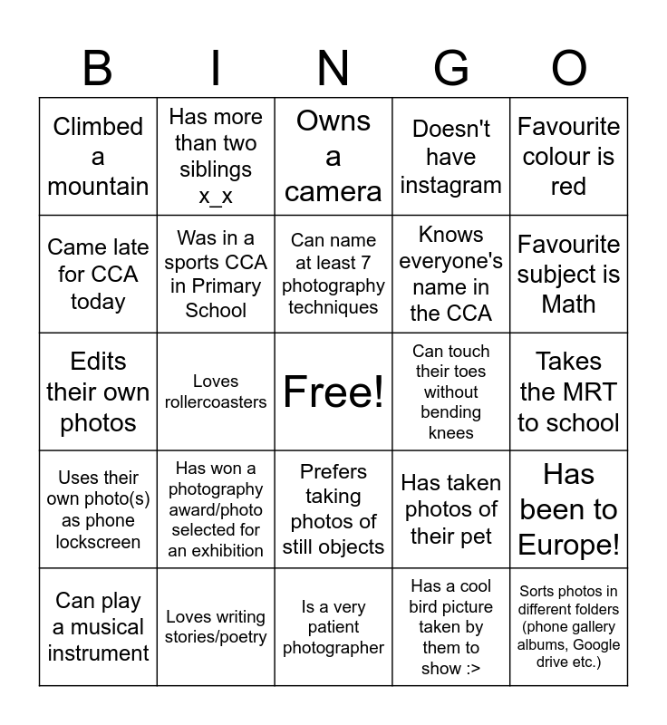 This bingo card has a free space and 24 words: Has won a photography award/photo selected for an exhibition, Loves writing stories/poetry, Can name at least 7 photography techniques, Can play a musical instrument, Favourite colour is red, Climbed a mountain, Came late for CCA today, Has more than two siblings x_x, Can touch their toes without bending knees, Prefers taking photos of still objects, Knows everyone's name in the CCA, Edits their own photos, Has taken photos of their pet, Has been to Europe!, Was in a sports CCA in Primary School, Has a cool bird picture taken by them to show :>, Takes the MRT to school, Owns a camera, Favourite subject is Math, Loves rollercoasters, Sorts photos in different folders (phone gallery albums, Google drive etc.), Uses their own photo(s) as phone lockscreen, Doesn't have instagram and Is a very patient photographer.
