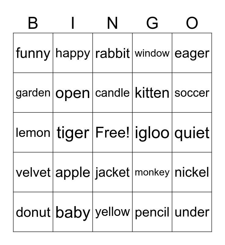 This bingo card has a free space and 24 words: apple, baby, candle, donut, eager, funny, garden, happy, igloo, jacket, kitten, lemon, monkey, nickel, open, pencil, quiet, rabbit, soccer, tiger, under, velvet, window and yellow.