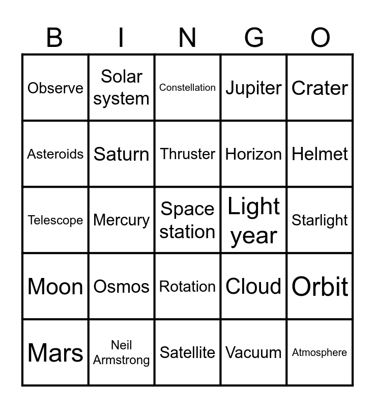 This bingo card has 62 words: Free!, Neil Armstrong, Solar panel, Moon, Atmosphere, Galaxy cluster, Saturn, Alien, Horizon, Robot, Jupiter, Solar eclipse, Asteroids, Space lab, Wormhole, Observe, Space station, Crater, Sky, Thruster, Light year, Constellation, Mars, Vacuum, Moonlight, Sunlight, Comet, Milky way, Orbit, Revolution, Rover, Sunrise, Space trip, Satellite dish, Starlight, Solar system, Shooting star, Discover, Mercury, Blue planet, Telescope, Star dust, Osmos, Planet core, Helmet, Cloud, Black hole, Space ship, Lunar eclipse, Gravity, Rotation, Satellite, Twilight, Lunar, Aurora, Space suit, Sky watch, Rocket, Universe, Space view, Asteroid belt and Sun.