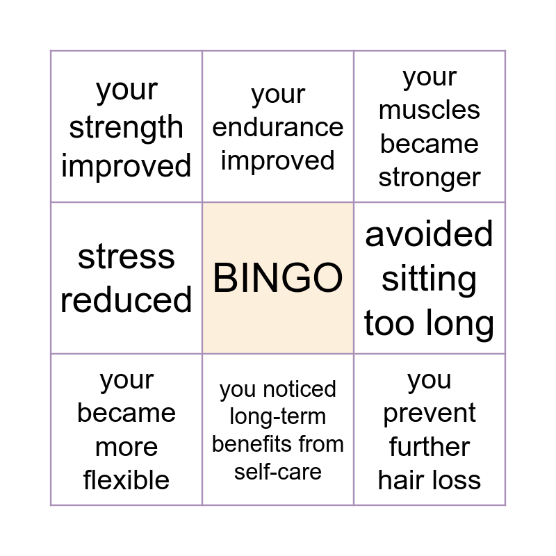 This bingo card has a free space and 8 words: avoided sitting too long, your muscles became stronger, your endurance improved, your became more flexible, your strength improved, you prevent further hair loss, stress reduced and you noticed long-term benefits from self-care.