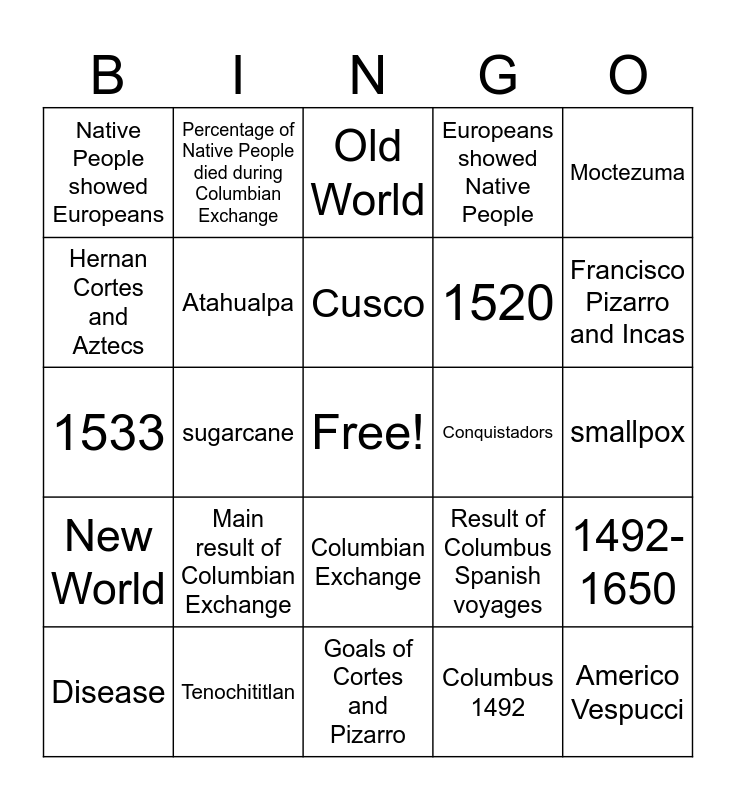 This bingo card has a free space and 24 words: Disease, Main result of Columbian Exchange, Cusco, Columbus 1492, Moctezuma, Native People showed Europeans, Percentage of Native People died during Columbian Exchange, Old World, Conquistadors, smallpox, 1533, Atahualpa, Result of Columbus Spanish voyages, 1492-1650, Hernan Cortes and Aztecs, Tenochititlan, Goals of Cortes and Pizarro, Europeans showed Native People, Francisco Pizarro and Incas, New World, sugarcane, Columbian Exchange, 1520 and Americo Vespucci.