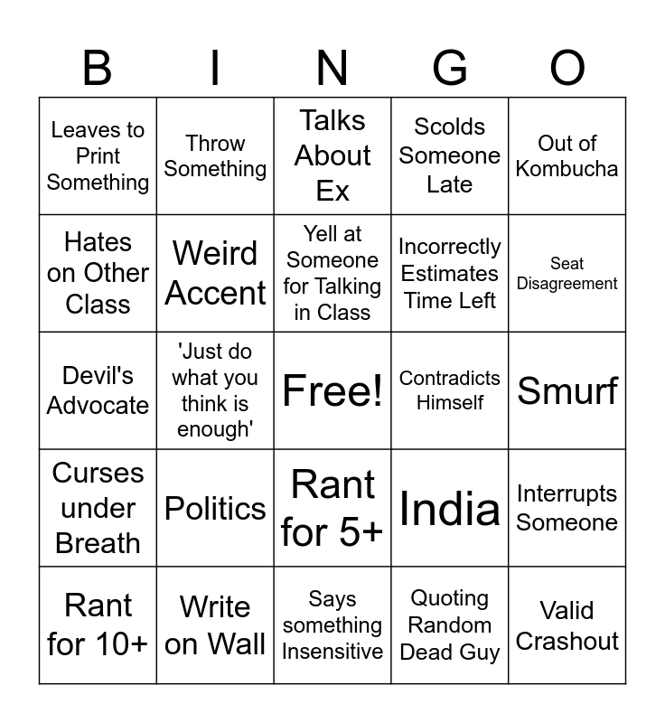 This bingo card has a free space and 34 words: Yell at Someone for Poor Work, Quoting Random Dead Guy, Germany, 'Don't quote me', Curses under Breath, Weird Accent, Out of Kombucha, Rant for 10+, Throw Something, Refills Bottle, Yell at Someone for Talking in Class, Talks About Ex, Listening to Music too Loud, Catches SOMEONE Playing Chess, Contradicts Himself, Seat Disagreement, Write on Wall, Devil's Advocate, Politics, India, Rant for 5+, Numbers aren't Real core, Leaves to Print Something, Smurf, Says something Insensitive, Valid Crashout, Scolds Someone Late, Talks about Past Jobs, Incorrectly Estimates Time Left, Hates on Other Class, Glazes Student, 'Just do what you think is enough', Interrupts Someone and Stone Skipping.