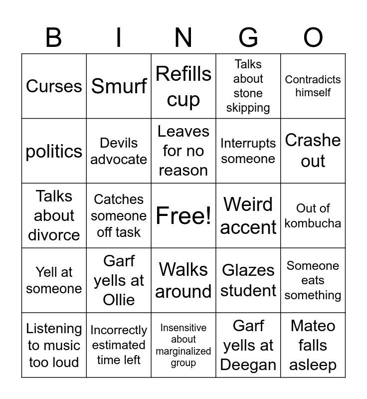 This bingo card has a free space and 29 words: Listening to music too loud, Rants about dead guy, Catches someone off task, Garf goes on a rant for 5+ min, Curses, Refills cup, Devils advocate, Garf yells at Ollie, Weird accent, Incorrectly estimated time left, Out of kombucha, Mateo falls asleep, Insensitive about marginalized group, Garf yells at Deegan, Crashe out, Garf yells at Mateo, Walks around, Yell at someone, Contradicts himself, Talks about divorce, Glazes student, Leaves to print, Interrupts someone, politics, Talks about stone skipping, Smurf, Someone eats something, Leaves for no reason and Talks about random experience.