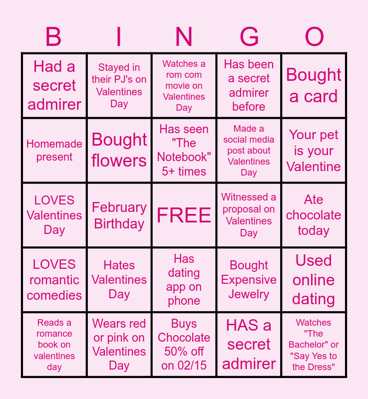 This bingo card has a free space and 24 words: Hates Valentines Day, Wears red or pink on Valentines Day, Has seen "The Notebook" 5+ times, Reads a romance book on valentines day, Bought a card, Had a secret admirer, Homemade present, Stayed in their PJ's on Valentines Day, Witnessed a proposal on Valentines Day, Has dating app on phone, Made a social media post about Valentines Day, LOVES Valentines Day, Bought Expensive Jewelry, Used online dating, Bought flowers, HAS a secret admirer, Ate chocolate today, Watches a rom com movie on Valentines Day, Your pet is your Valentine, February Birthday, Watches "The Bachelor" or "Say Yes to the Dress", LOVES romantic comedies, Has been a secret admirer before and Buys Chocolate 50% off on 02/15.