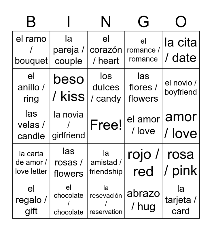 This bingo card has a free space and 24 words: las rosas / flowers, el chocolate / chocolate, los dulces / candy, el regalo / gift, la cita / date, el ramo / bouquet, el anillo / ring, la pareja / couple, el amor / love, la amistad / friendship, las flores / flowers, las velas / candle, rojo / red, rosa / pink, beso / kiss, abrazo / hug, amor / love, el corazón / heart, el novio / boyfriend, la novia / girlfriend, la tarjeta / card, la carta de amor / love letter, el romance / romance and la resevación / reservation.