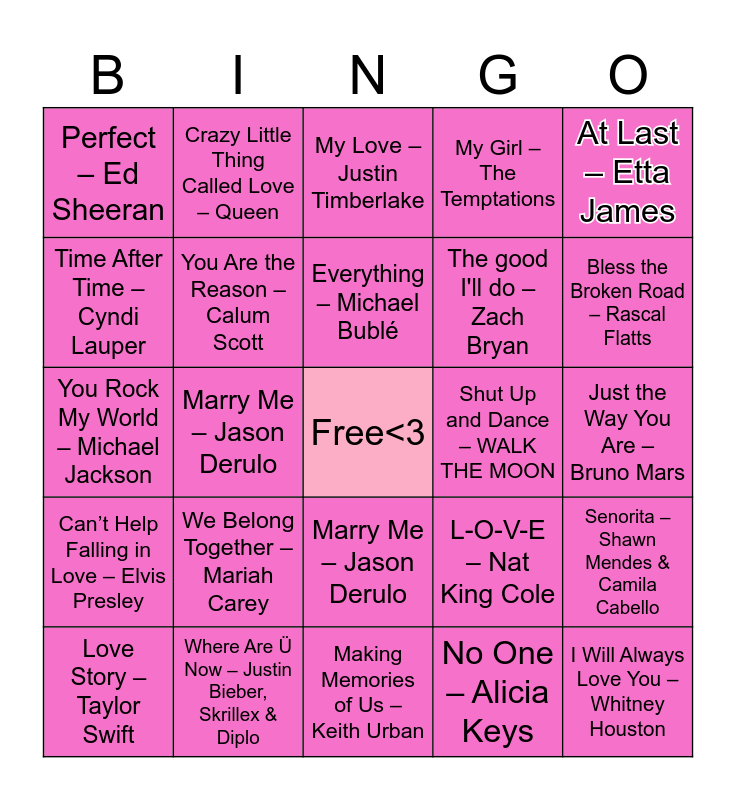This bingo card has a free space and 24 words: Love Story – Taylor Swift, We Belong Together – Mariah Carey, Everything – Michael Bublé, No One – Alicia Keys, At Last – Etta James, Perfect – Ed Sheeran, Crazy Little Thing Called Love – Queen, My Love – Justin Timberlake, Shut Up and Dance – WALK THE MOON, Just the Way You Are – Bruno Mars, You Rock My World – Michael Jackson, You Are the Reason – Calum Scott, L-O-V-E – Nat King Cole, Senorita – Shawn Mendes & Camila Cabello, Time After Time – Cyndi Lauper, Where Are Ü Now – Justin Bieber, Skrillex & Diplo, Making Memories of Us – Keith Urban, My Girl – The Temptations, Bless the Broken Road – Rascal Flatts, Can’t Help Falling in Love – Elvis Presley, Marry Me – Jason Derulo, Marry Me – Jason Derulo, The good I'll do – Zach Bryan and I Will Always Love You – Whitney Houston.