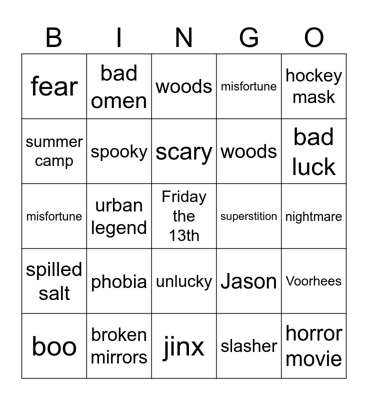 This bingo card has a free space and 24 words: phobia, broken mirrors, scary, boo, hockey mask, fear, summer camp, bad omen, superstition, unlucky, woods, misfortune, Jason, Voorhees, spooky, slasher, nightmare, woods, bad luck, urban legend, horror movie, spilled salt, misfortune and jinx.