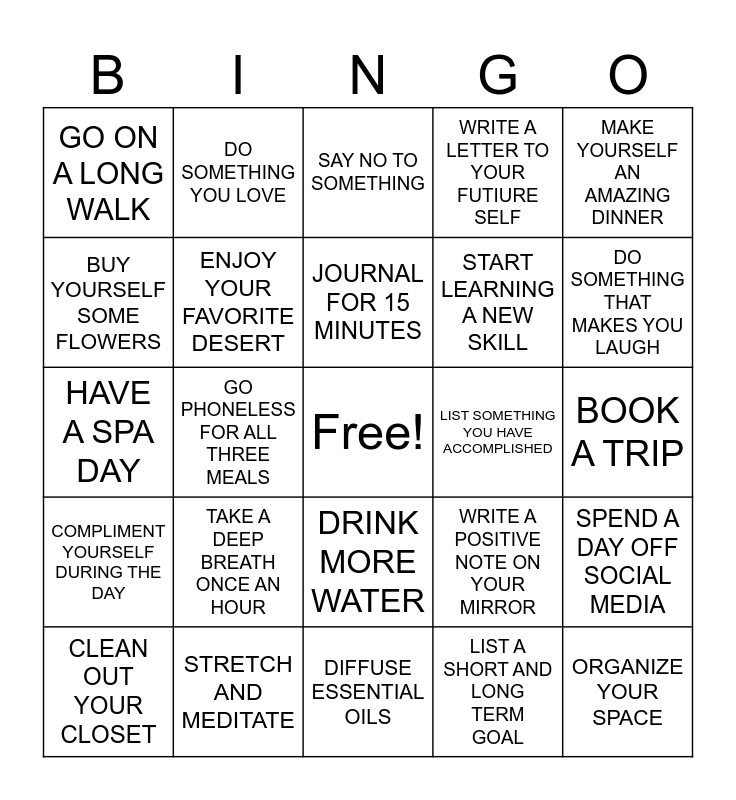 This bingo card has a free space and 24 words: TAKE A DEEP BREATH ONCE AN HOUR, STRETCH AND MEDITATE, JOURNAL FOR 15 MINUTES, CLEAN OUT YOUR CLOSET, MAKE YOURSELF AN AMAZING DINNER, GO ON A LONG WALK, BUY YOURSELF SOME FLOWERS, DO SOMETHING YOU LOVE, LIST SOMETHING YOU HAVE ACCOMPLISHED, DRINK MORE WATER, START LEARNING A NEW SKILL, HAVE A SPA DAY, WRITE A POSITIVE NOTE ON YOUR MIRROR, SPEND A DAY OFF SOCIAL MEDIA, ENJOY YOUR FAVORITE DESERT, LIST A SHORT AND LONG TERM GOAL, BOOK A TRIP, SAY NO TO SOMETHING, DO SOMETHING THAT MAKES YOU LAUGH, GO PHONELESS FOR ALL THREE MEALS, ORGANIZE YOUR SPACE, COMPLIMENT YOURSELF DURING THE DAY, WRITE A LETTER TO YOUR FUTIURE SELF and DIFFUSE ESSENTIAL OILS.