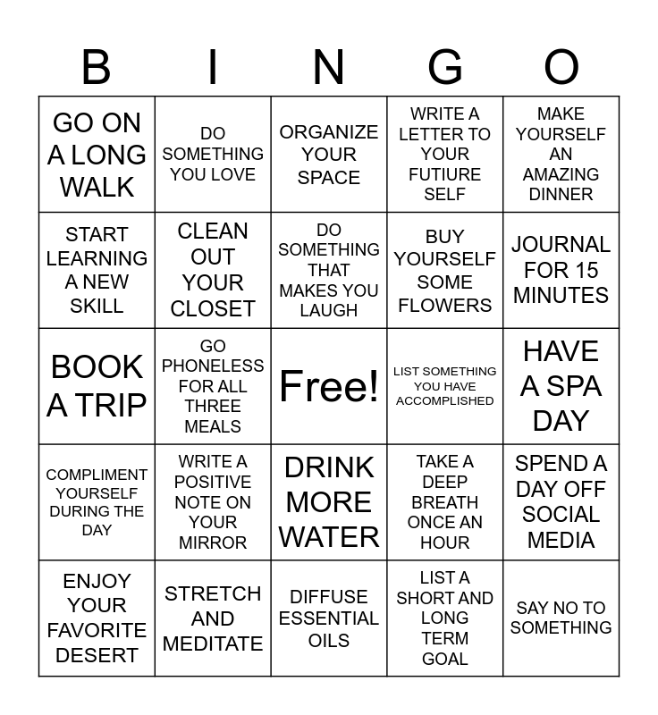 This bingo card has a free space and 24 words: WRITE A POSITIVE NOTE ON YOUR MIRROR, STRETCH AND MEDITATE, DO SOMETHING THAT MAKES YOU LAUGH, ENJOY YOUR FAVORITE DESERT, MAKE YOURSELF AN AMAZING DINNER, GO ON A LONG WALK, START LEARNING A NEW SKILL, DO SOMETHING YOU LOVE, LIST SOMETHING YOU HAVE ACCOMPLISHED, DRINK MORE WATER, BUY YOURSELF SOME FLOWERS, BOOK A TRIP, TAKE A DEEP BREATH ONCE AN HOUR, SPEND A DAY OFF SOCIAL MEDIA, CLEAN OUT YOUR CLOSET, LIST A SHORT AND LONG TERM GOAL, HAVE A SPA DAY, ORGANIZE YOUR SPACE, JOURNAL FOR 15 MINUTES, GO PHONELESS FOR ALL THREE MEALS, SAY NO TO SOMETHING, COMPLIMENT YOURSELF DURING THE DAY, WRITE A LETTER TO YOUR FUTIURE SELF and DIFFUSE ESSENTIAL OILS.
